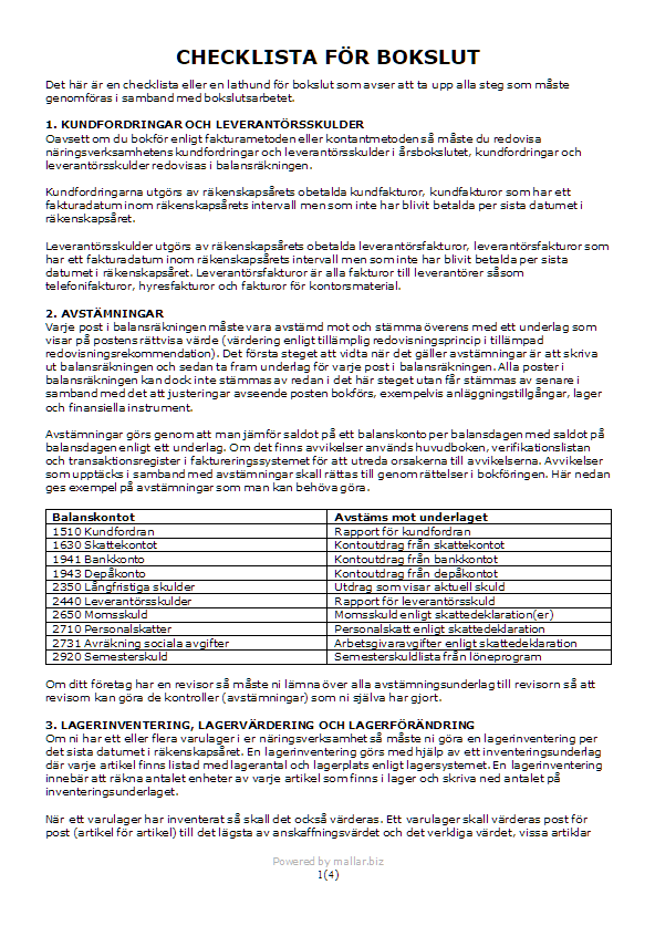 Den här mallen med en checklista för bokslut syftar till att ge en kortfattad beskrivning av de olika steg som krävs för att färdigställa ett bokslut och därför görs hänvisningar till information på Internet där man kan läsa mer om de enskilda stegen.